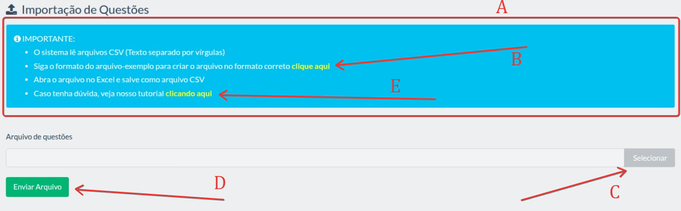 B - nesse link você terá o formato do arquivo que deverá ser importado. Apenas dessa forma irá funcionar a importação de questões.